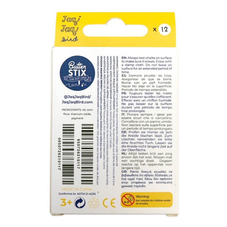 Confezione con 12 gessetti bianchi Butterstix (BSW) - Gessetti zero polvere, non macchiano e sono facilmente lavabili dalle superfici. Utilizzabili su tutte le superfici non porose come lavagne non in ardesia, vetro, plastica ma soprattutto su tutti prodotti JAQ JAQ BIRD