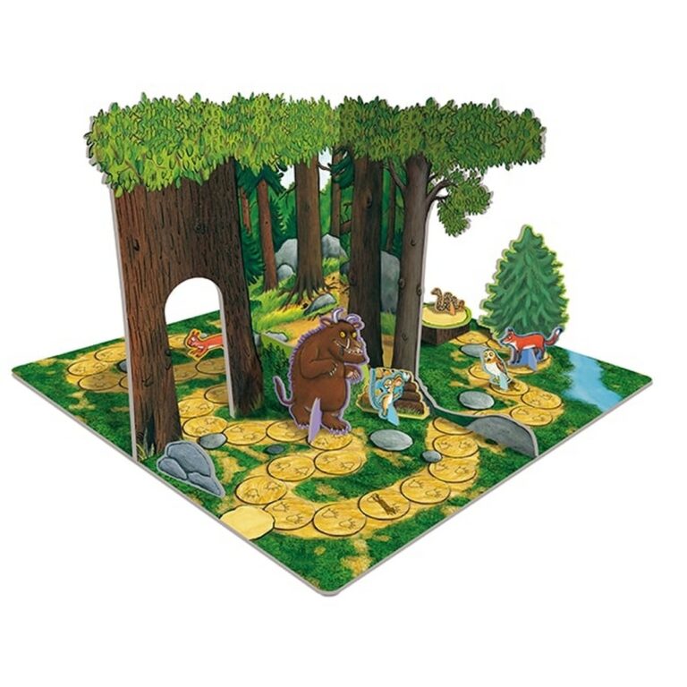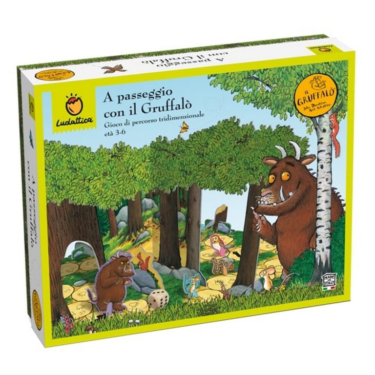 A passeggio con il Gruffalò - Un gioco di percorso tridimensionale, il cui obiettivo è recuperare i gettoni componi-storia all’interno del bosco, in compagnia del Gruffalò e dei suoi amici animali. Contenuto: scenario tridimensionale, dado il legno, 8 personaggi tridimensionali con card stand, elementi tridimensionali, scheda con gettoni componi-storia, istruzioni. Età: 3+