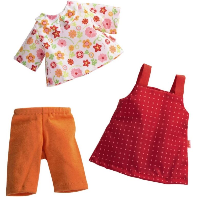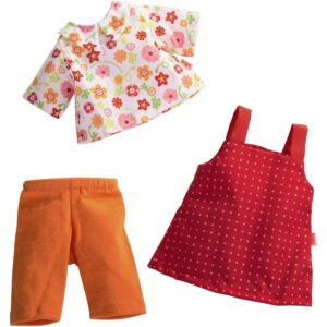 Abito Lilli per bambole in stoffa HABA. Contenuto: camicetta, vestito, leggings. Adatto per bambole Haba da 30 cm.
