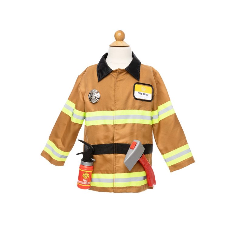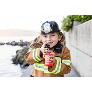 Il set comprende un cappotto rosso con dettagli in nastro riflettente, cappello da vigile del fuoco in plastica con stemma, stemma personalizzato removibile, ascia da gioco e estintore (che in realtà è una pistola ad acqua!).