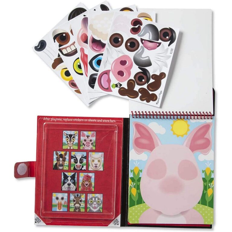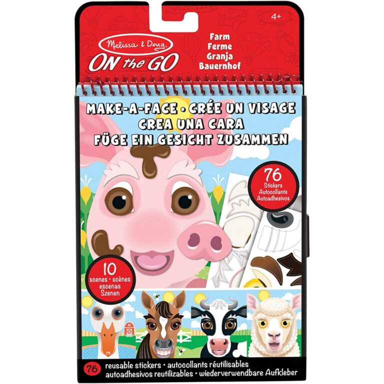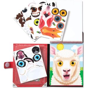Album adesivi riutilizzabili "Make a Face" - Animali Fattoria. Crea simpatici e divertenti musi di animali tutte le volte che vuoi. Include 10 scenari a tema animali della fattoria e 76 adesivi riutilizzabili (occhi, nasi, bocche e altro). L'album "make a face" è l'ideale per i viaggi in auto o in aereo con bimbi, dato che è compatto, non sporca ed è facile da utilizzare e mettere via. Età: 3+