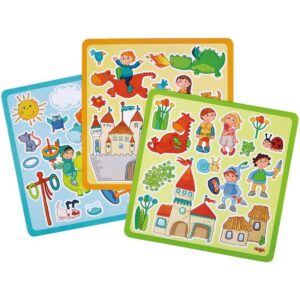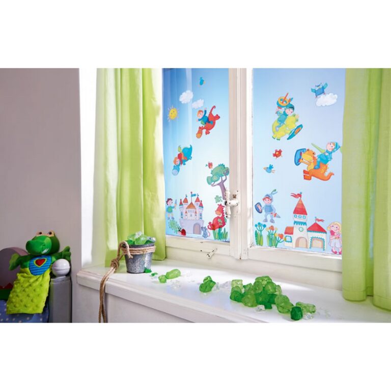Gli adesivi portano alla finestra un'atmosfera da favola: i cavalieri e i loro draghi sfrecciano tra le nuvole o combattono a terra. Con il castello, gli alberi e altre figure e animali, molte scene vivaci possono essere incollate alla finestra.