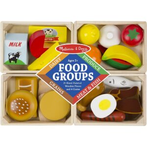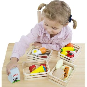 Alimenti in legno - Pianificare un pasto ben bilanciato è un gioco da ragazzi con questo set di cibo da gioco in legno. Sono incluse quattro cassette giocattolo in legno per suddividere il cibo in gruppi: latticini, frutta e verdura, cereali, carne e pesce. I bambini possono anche ordinare per colore o utilizzare le casse per combinare gli alimenti per servire pasti finti. Età: 3+