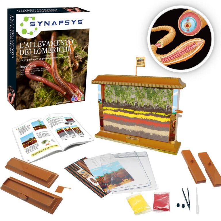 Il set contiene un kit per costruire una teca in cui allevare i lombrichi: sabbia colorata, pinzette, adesivi e molto altro.