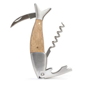 Cavatappi in acciaio inox resistente con taglierino e impugnatura in legno massello. Include: apribottiglie e tagliacapsule.
