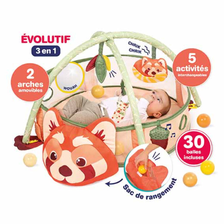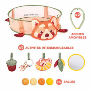 Gli archi rimovibili e le attività intercambiabili si adattano alle esigenze del bambino. Inoltre, una tasca portaoggetti nascosta nella testa del panda permette di riporre rapidamente palline e giochi. Compatto (⌀ 75 cm), morbido e facile da piegare, l’area gioco è perfetta da usare in casa o da portare in viaggio.