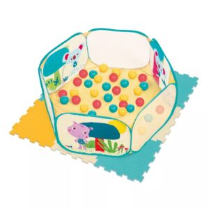 Troverai un'area gioco che si apre in un attimo, un morbido tappetino formato da 9 pezzi che si incastrano e 40 palline colorate e resistenti.