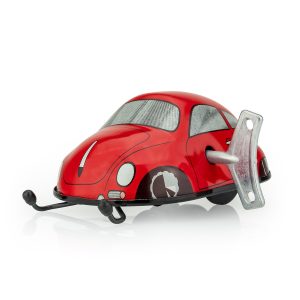 La sua forma arrotondata e compatta, realizzata in metallo con la cura artigianale tipica di Kovap, evoca le prime auto popolari, mentre il colore rosso brillante aggiunge un tocco di vivacità.