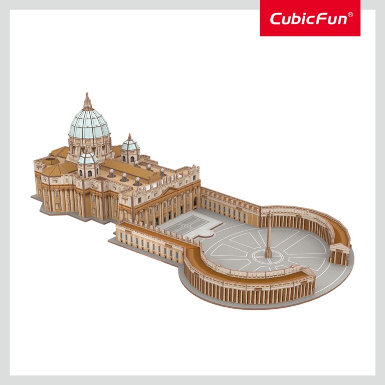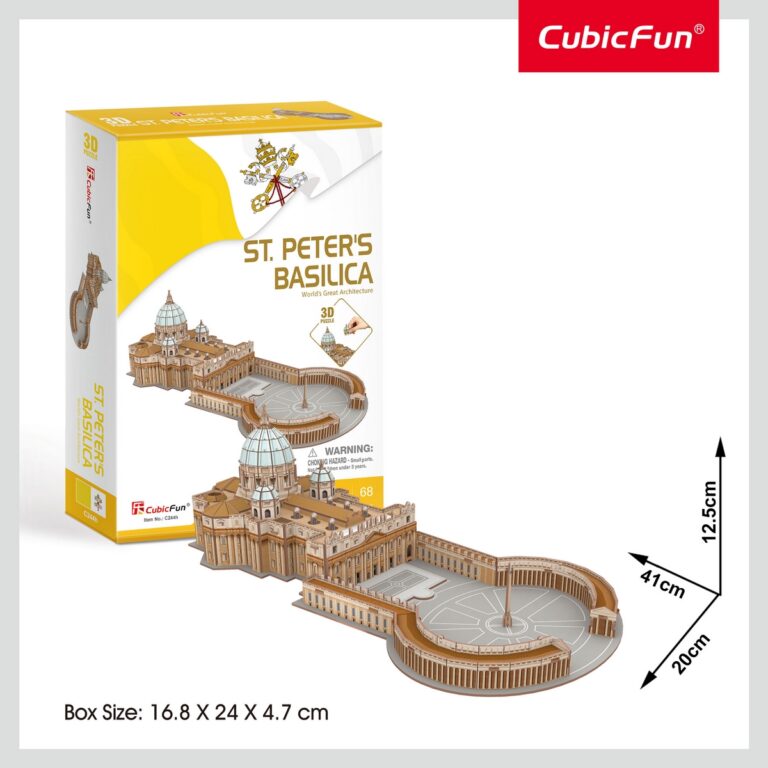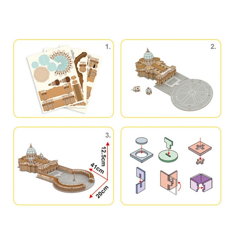 Puzzle 3D divertente e stimolante per replicare la Basilica di San Pietro a Roma. Facilissimo da assemblare, senza bisogno di forbici, colla o nastro adesivo. Numero di pezzi : 68 . Dimensioni : 41 x20 x 12,5 cm Tempo di costruzione : 150/180 minuti.