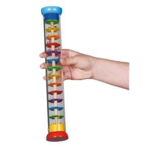 Tubo in plastica che contiene mini sfere in metallo. Capovolgendolo si sente il picchiettio delicato della pioggia. Un’esperienza sonora suggestiva per grandi e piccini. Lungh: 34 cm. Diam: 5,5 cm