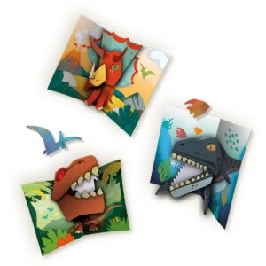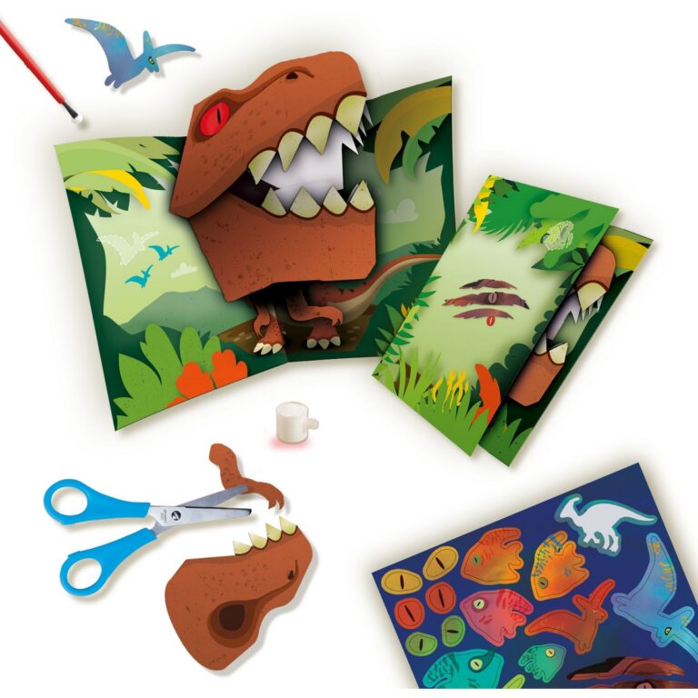 SES Creative Biglietti con Dinosauri Popup. Non essere sorpreso quando apri il biglietto! Sembrerà che un dinosauro stia per uscire dal biglietto. Con questo set puoi creare i tuoi biglietti con gli inserti dei dinosauri. Ritaglia le parti con le forbici incluse e incollale insieme correttamente. Completa i biglietti con gli adesivi metallici inclusi. Chi spaventerai con questi paurosi biglietti? Età: 5+