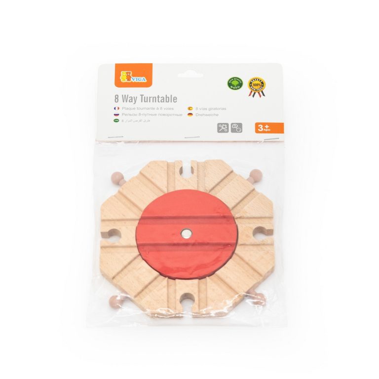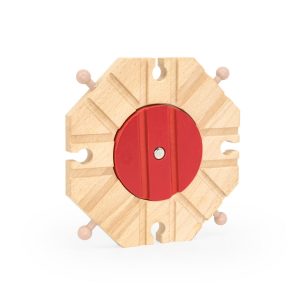 Questa piattaforma girevole Viga per trenino in legno aggiunge un elemento dinamico e interattivo ai circuiti ferroviari dei bambini.