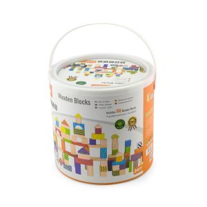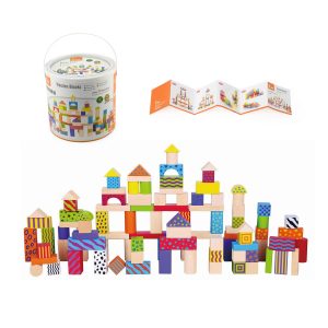 Questo set include 100 blocchi di legno di diverse forme e colori, perfetti per costruire torri, castelli, case e tutto ciò che la fantasia suggerisce.