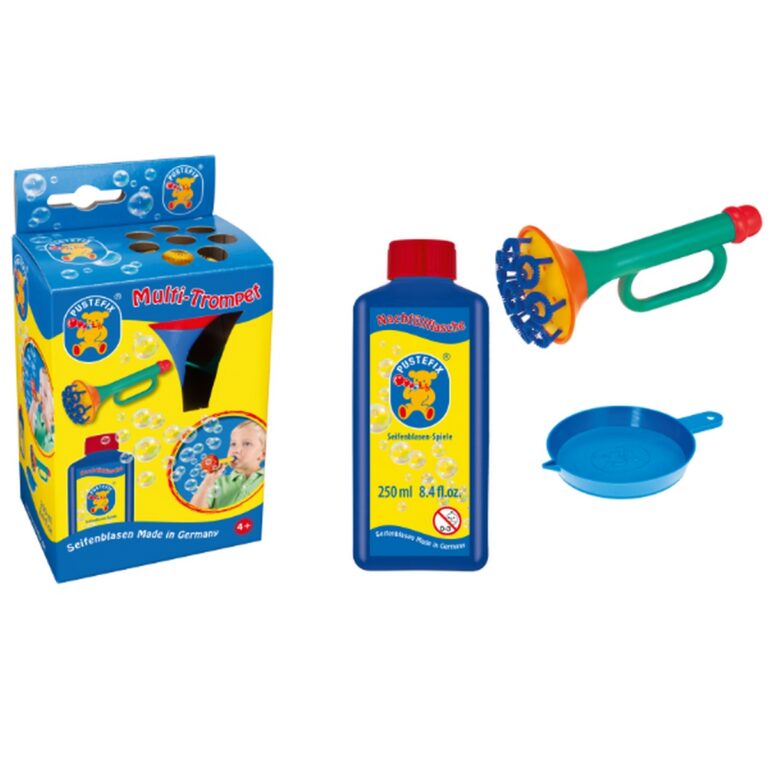 Soffia nella trombetta e come per magia tantissime bolle voleranno nel cielo! Dal 1948 Pustefix produce giocattoli e altri articoli per fare bolle di sapone per bambini. Il liquido Pustefix, fabbricato in Germania secondo una formula segreta, è famoso in tutto il mondo per le belle bolle con i colori dell'arcobaleno. Ovviamente è del tutto sicuro per i bambini!