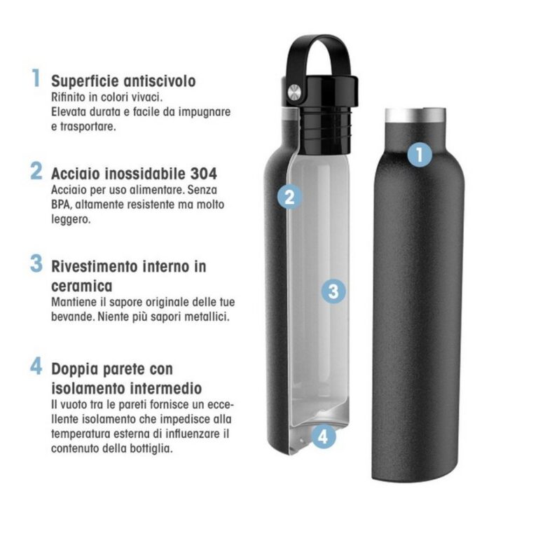 • Base antiscivolo: stabilità assicurata. La base in gomma antiscivolo impedisce alla borraccia di scivolare o cadere, proteggendola da urti e graffi.