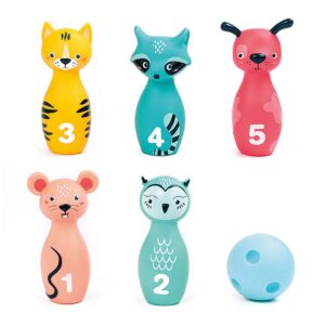 Colori vivaci e disegni di animali sui birilli incoraggiano il riconoscimento visivo e la familiarità con gli animali. La palla, con un'impugnatura ergonomica a tre dita, è progettata in modo che anche i più piccoli possano giocare facilmente!