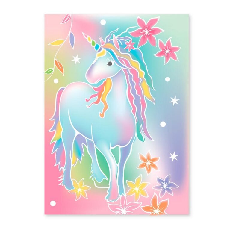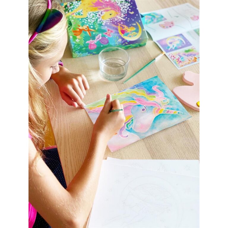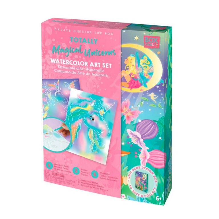 Dipingi magici unicorni con il BOX CANDIY Totally Magical Unicorns Acquarelli. Il set include : 6 fogli da colorare, 1 pennello a punta larga e 1 pennello a punta fine, 1 tavolozza di colori a forma di unicorno con 6 acquerelli e istruzioni, il tutto in un’incantevole scatola per ricordi realizzata in cartone riciclato.