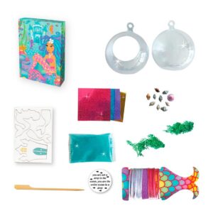 Include: 1 ciotola per terrario in plastica, 1 sacchetto di sabbia blu, 4 figure di cartone con uno strato di carta adesiva, 4 fogli di alluminio, 1 bastoncino di legno, piante di alghe decorative verdi, circa 10 conchiglie decorative, adesivi, pizzi e corde colorati e istruzioni, il tutto in una bellissima scatola portaoggetti in cartone riciclato.