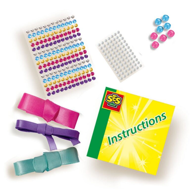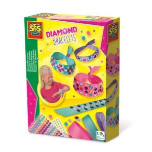 SES Creative Braccialetti di diamanti. Gioielli super belli e scintillanti! Molto facili da realizzare e da adattare alla giusta dimensione del polso. I bambini possono dare sfogo alla loro creatività, attaccando i diamanti sui nastri di raso trasformandoli così in gioielli unici! Poiché i diamanti sono autoadesivi, non c’è bisogno di pasticciare con la colla e i bambini possono realizzare i gioielli da soli! Contenuto della confezione: Nastro di raso rosa; Nastro di raso viola; Nastro di raso turchese; 180 adesivi a diamante in 5 colori; 84 adesivi di perline; Perline in 2 colori; Istruzioni. Età: 3+