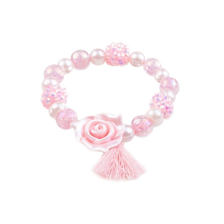 Lasciati conquistare dalla magia di questo bracciale, dove il rosa è il protagonista assoluto. Un grande ciondolo a forma di rosa, con una nappa morbida come una piuma, cattura lo sguardo.