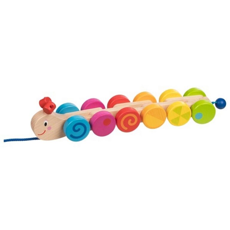Gli anelli che scorrono l’uno dentro l’altro gli conferiscono la sua andatura inconfondibile. Il pezzo forte sono le ruote di forma diversa e opportunamente combinate, che accompagnano la corsa del bruchetto con un vivace gioco di colori.