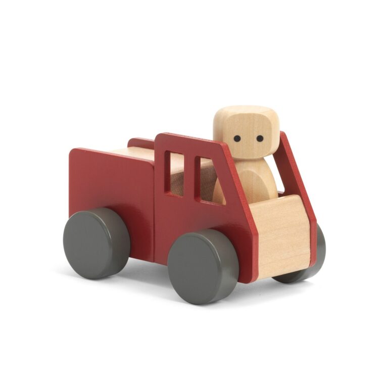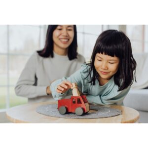Camion dei pompieri e figurine in legno che incoraggiano il gioco fantasioso.