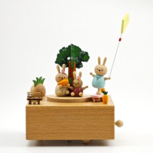 Porta un tocco di magia nella cameretta con il Carillon Coniglietto sullo Skate. Stai cercando un regalo che sappia sorprendere e incantare? Questo carillon in legno di alta qualità è un piccolo scrigno di allegria. La scena rappresenta un coniglietto che gioca sullo skateboard insieme a due amici seduti all’ombra di un ciliegio in fiore, arricchita da piccoli dettagli adorabili come carote e un aquilone che volteggia nel vento.