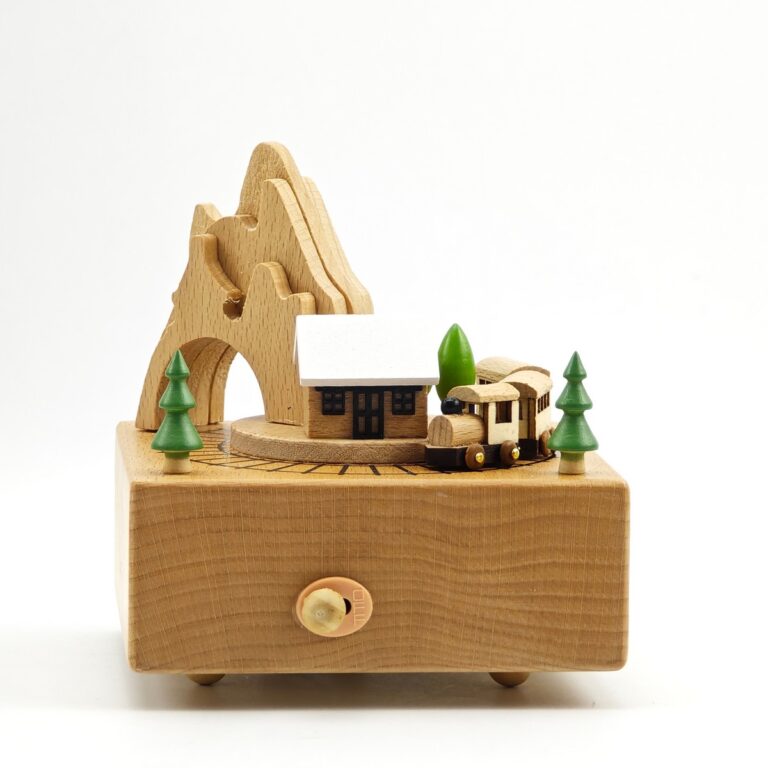 Porta un po’ di magia alpina nella cameretta o in casa con il Carillon Trenino delle Montagne. Cerchi un regalo che unisca musica, movimento e fascino naturale? Questo carillon in legno di alta qualità è un piccolo scrigno di meraviglia. La scena rappresenta un trenino finemente rifinito che percorre un binario circolare e scompare sotto un arco che richiama le forme delle montagne, accompagnato da una piccola baita dal tetto bianco e pini verdi che completano un paesaggio armonioso ed elegante.