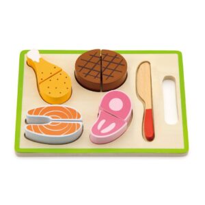 Il set è composto da diverse pietanze realizzate in legno di alta qualità, inclusi un tagliere e un coltello sicuro per i bambini. Ogni alimento è colorato con vernici atossiche e può essere "tagliato" in due parti grazie al velcro che le tiene insieme.
