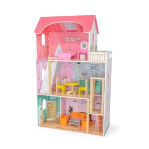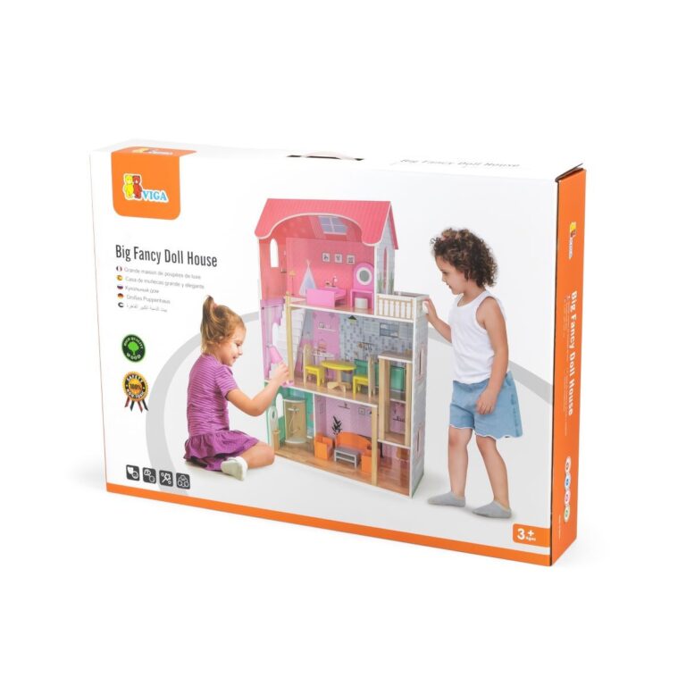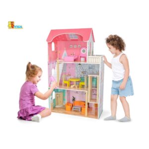 La casa delle bambole a tre piani di Viga è un giocattolo in legno progettato per stimolare l'immaginazione e le capacità motorie dei bambini.