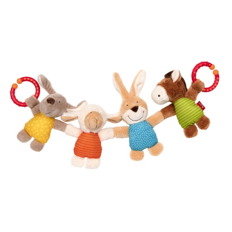 Catenella per passeggino - Animali della Fattoria. Cane, pecora, coniglio e cavallo amano stare in giro: in macchina o durante una passeggiata al parco, i peluche intrattengono il bambino con un dolce tintinnio. La catena è facile da attaccare al passeggino o alla carrozzina. Dimensioni (L x A x L in cm): 13 x 7 x 42 - Età: +0M