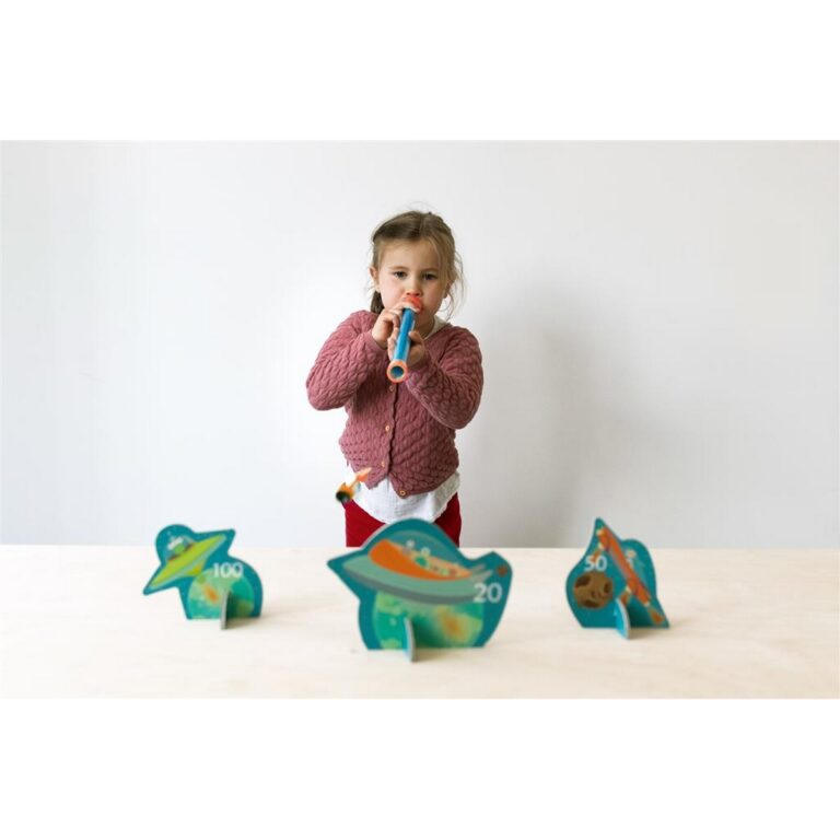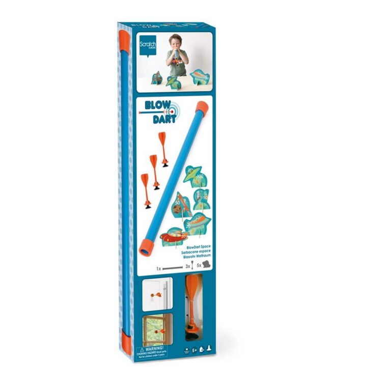 Cerbottana Spazio Scratch. Carica…soffia…colpisci! Inserire una freccetta dentro la cerbottana, mirare un bersaglio, inspirare profondamente e soffiare! Le freccette possono arrivare fino a 10m. Il gioco può essere utilizzato sia all'interno che all'esterno. Dimensione cerbottana: 42cm - Dimensione freccetta: 8,5 cm - Età: 5+