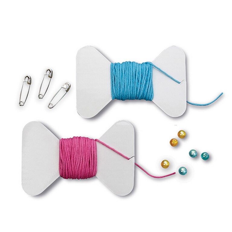 Contenuto: 1 rocchetto di corda rosa, 1 rocchetto di corda blu, 3 perline gialle, 3 perline blu, 3 spille da balia e istruzioni dettagliate.