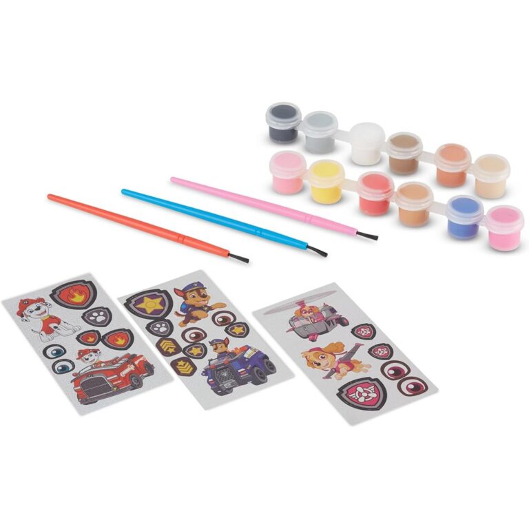 Questo set include 12 vivaci colori a tempera, 3 pennelli facili da usare e 3 fogli di adesivi in lamina. Le figure in resina di Chase, Marshall e Skye sono pronte a essere personalizzate.