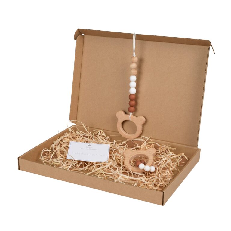 Questa scatola contiene un anello da dentizione in legno a forma di orsetto e un resistente portaciuccio, così il tuo bambino avrà il suo ciuccio sempre a disposizione!