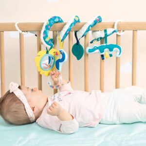 Crocco Spirale Gioco da Passeggino - Una bella spirale di attività che si avvolge a molteplici supporti, dal lettino al seggiolino dell'auto. Composta da diverse attività sensoriali (anello da dentizione, specchio, pouêt pouêt).Età: +0M