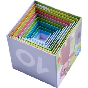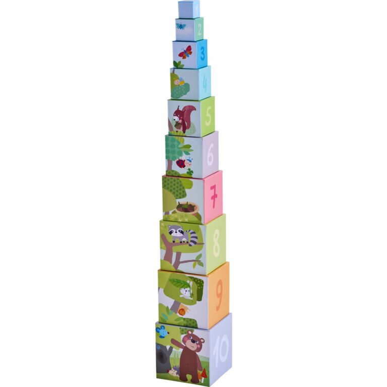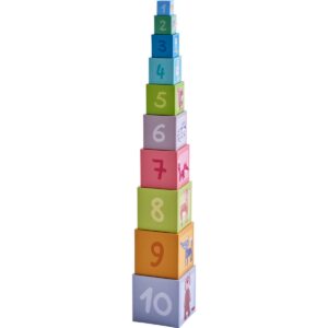 Con i cubi impilabili di HABA, i bambini si divertono a costruire torri e imparano i numeri da 1 a 10 . Ciascuno dei cubi impilabili in cartone presenta un animale , un colore e un numero divero. Possono essere allineati uno accanto all’altro, impilati l’uno sull’altro e inseriti l’uno nell’altro.  Età: 1+