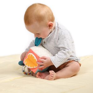 Cubo in stoffa prime attività - Questo giocattolo sensoriale è perfettamente adattato per facilitare la manipolazione e stimolare i sensi del bambino. Sviluppa la destrezza e la coordinazione dei movimenti del bambino. Il cubo attività diventerà presto un fedele compagno a casa e durante i viaggi in famiglia! Dimensioni: 10 x 15 x 10 cm. Età: +3M