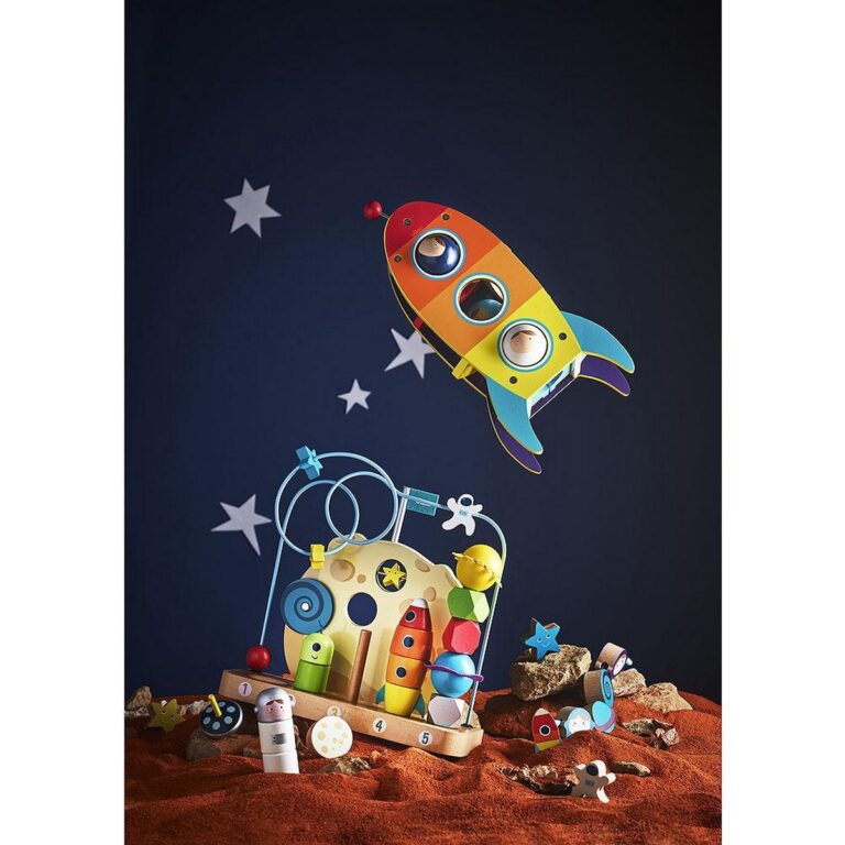 Il giocattolo è a tema spaziale ed è composto da diversi astronauti, un UFO , un razzo e pianeti con cui i bambini possono svolgere diverse attività ed imparare a contare riconoscendo e associando forme e colori. Età: + 18M