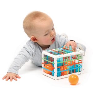 Cubo per la manipolazione - Un sorprendente cubo con elastici che racchiudono 12 palline colorate dal divertente suono. Questo originale gioco sviluppa la presa, la logica e le capacità motorie. I bambini si divertono ad inserire le palline nel cubo attraverso gli elastici colorati, per poi toglierle. Le 12 palline dai colori vivaci attirano l'attenzione dei bambini. Le 4 palline arancioni sono leggere e flessibili ma resistenti: il tuo bambino le potrà schiacciare a suo piacimento, torneranno alla loro forma iniziale. Le 8 palline blu, realizzate in plastica dura, emettono un piccolo rumore di maracas che risveglia la curiosità sonora dei bambini. Dimensione cubo: 18 x 12 x 12 cm - Palline: ø 4,5 cm. Età: +10M