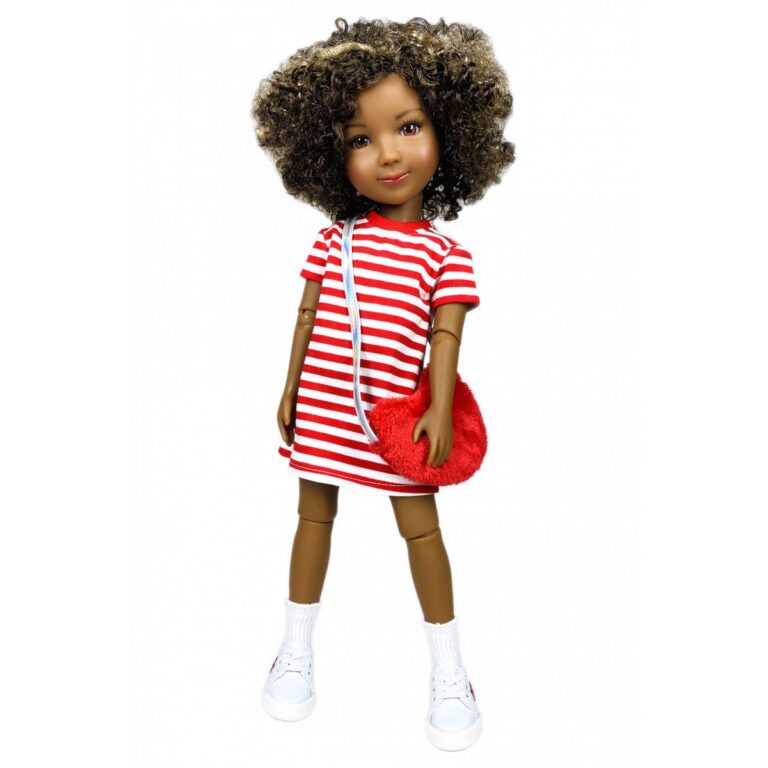 Outfit per bambole Ruby Red Fashion Friends (37 cm). Ti distinguerai tra la folla con questo outfit di cui chiunque si innamorerebbe! Composto da un abito a righe rosse e bianche con giacca coordinata, una deliziosa borsetta rossa pelosa, calzini bianchi e scarpe da ginnastica con un grande cuore rosso. Bambola non Inclusa