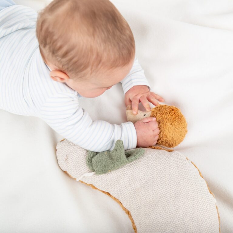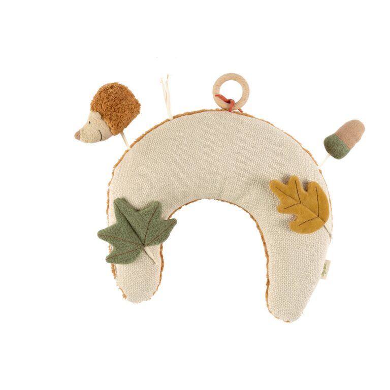 Cuscino tattile prime attività - Bosco. Il morbido cuscino a forma di mezzaluna presenta molteplici attività per bambini, con una ghianda sonaglio, un riccio squeaker, foglie fruscianti e un anello massaggiagengive in legno da afferrare e masticare. Offre al tuo piccolo un supporto per allenare i suoi muscoli vitali e fornisce anche un interessante cambiamento nella linea di vista del bambino. Dimensione: 37 x 10 x 33 cm - Età: +3M