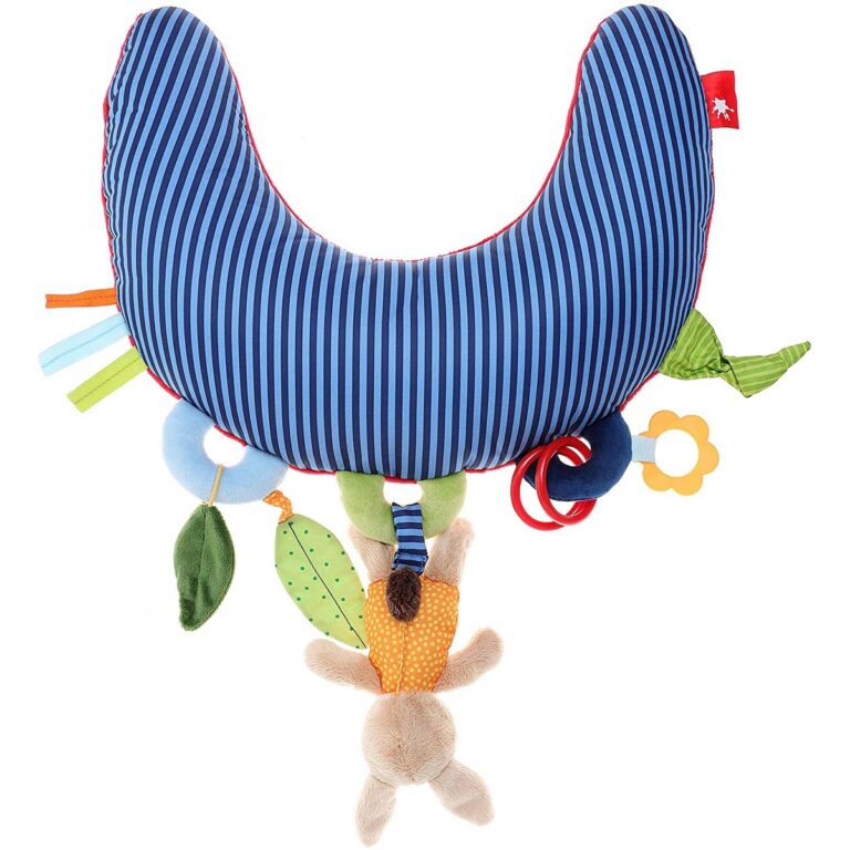 Cuscino attività PayQ di Sigikid, con anelli da dentizione, sonaglietti, un peluche coniglietto e tanti colori per stimolare tutti i sensi del bambino. Dimensione: 37x36x9 cm - Età: +0M