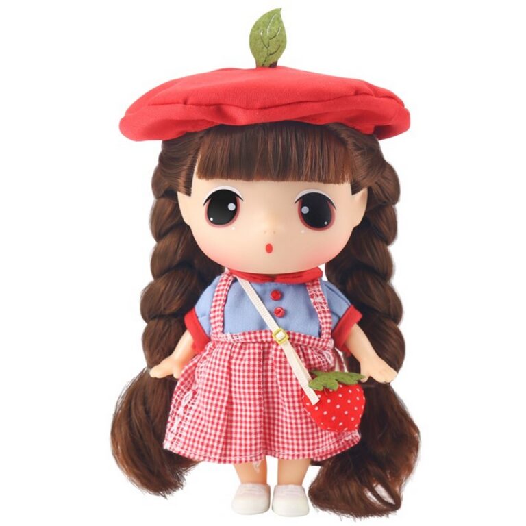 Bambola DDUNG Fragola Edition in abito a quadretti con borsetta a fragola e cappello rosso. Alta 18 cm, ideale per gioco e collezione.