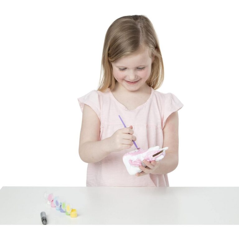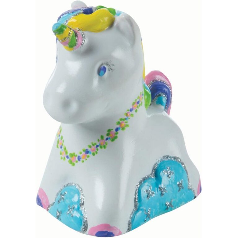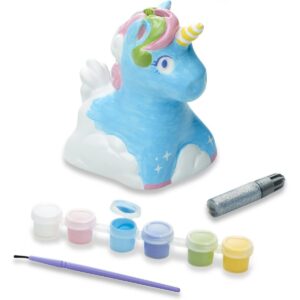 Con questo kit, i bambini potranno dare vita alla loro immaginazione decorando un bellissimo salvadanaio a forma di unicorno. Colori vivaci, pennelli e colla glitterata sono inclusi per creare un'opera d'arte unica.