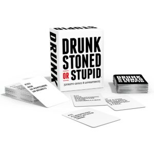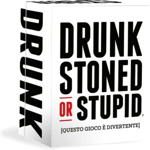 Drunk, Stoned or Stupid - gioco da tavolo. Drunk, Stoned or Stupid è un irriverente gioco di carte per creare nuove amicizie, per rompere il ghiaccio, per conoscere persone e per conoscere meglio quelle che pensavate di conoscere bene (e invece...). Nel corso della partita verranno svelati difetti e pregi, scheletri nell’armadio, passioni, vizi e segreti indicibili dei partecipanti. Ci si accuserà a vicenda, ci si difenderà e giudicherà, ma soprattutto si riderà un sacco, insieme. Cosa c'è di più bello? Il regolamento di Drunk, Stoned or Stupid è facilissimo. Il giocatore pesca una carta, la legge a voce alta e decide a chi assegnarla e fornendo le ragioni della sua scelta. Chi è, tra i partecipanti, il più tirchio? Chi rischierebbe la vita per un selfie? Chi racconta sempre la solita stramaledetta storia? Chi lo ha fatto nel posto più strano? Provate a difendervi affinché non vi venga assegnata la carta, perché il primo che colleziona 7 carte perde la partita. Più si è, meglio è, si dice. Drunk, Stoned or Stupid è un gioco perfetto per essere condiviso con gli amici: tutti quelli che volete. Non essendoci limite di giocatori, si presta benissimo anche per partite con gruppi numerosi. Ma può essere gustato anche in pochi, pochissimi. Il formato compatto e solido permette di portare il gioco ovunque, per poterlo sfoderare sempre, in qualsiasi occasione e luogo. Perché è sempre il momento giusto per un giro di Drunk, Stoned or Stupid. Età consigliata: 18+