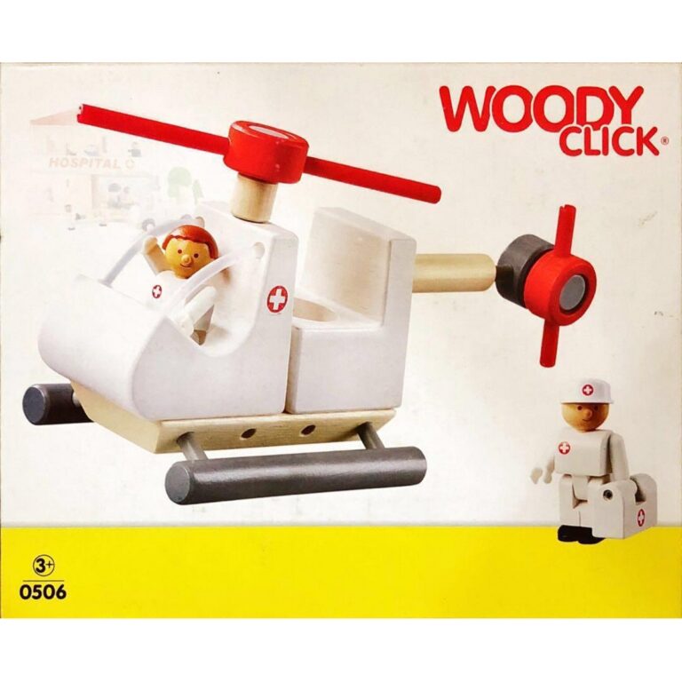 L' elisoccorso Woody Click è pronto a prendersi cura dei tuoi "Woodies" feriti e malati! L'ospedale include un medico con borsa medica. I giocattoli in legno Woody Click sono molto più che semplicemente carini! Woody Click con un semplice "clic" permette ai bambini di costruire edifici e veicoli usando gli schemi prestabiliti o usando la propria immaginazione promuovendo così la creatività e la concentrazione. Le forme moderne orientate al design allenano e migliorano anche la consapevolezza estetica. Il bambino potrà così vivere tutte le avventure della vita quotidiana, cimentandosi in giochi di ruolo con tanti simpatici personaggi snodabili. Costruiti con legno dell'albero della gomma e colorati con vernice a base d'acqua. Età consigliata: 3+