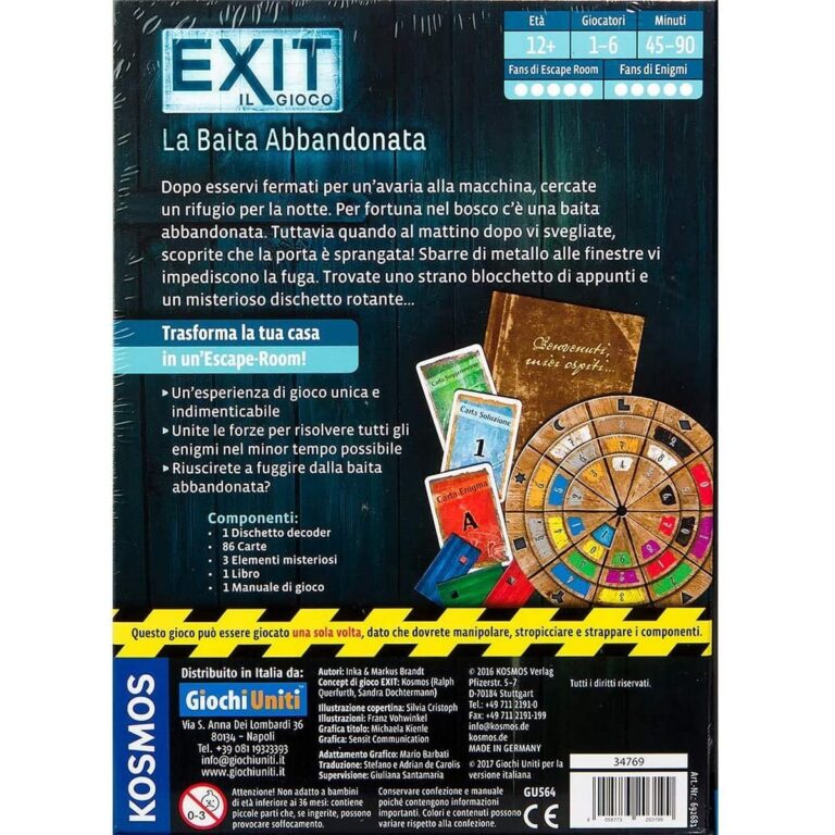 Avete trovato rifugio da una tempesta in una baita abbandonata.. Sfortunatamente la mattina dopo vi accorgete che la porta è stata chiusa con un lucchetto e le finestre sono sbarrate. Davanti a voi sono comparsi un libro e un misterioso dischetto rotante. Vi rendete conto che l’unico modo per uscire è unire le forze per riuscire ad aprire ogni lucchetto risolvendo l’enigma che lo contrassegna. Età: 12+