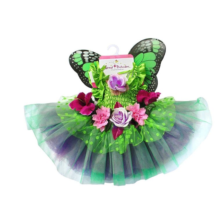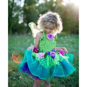 Il top in raso elasticizzato consente alla tua piccola fata di essere libera nei movimenti. Fluttuerà nella gonna in tulle verde e viola ricamata da tanti fiori colorati! Le ali completano il look.