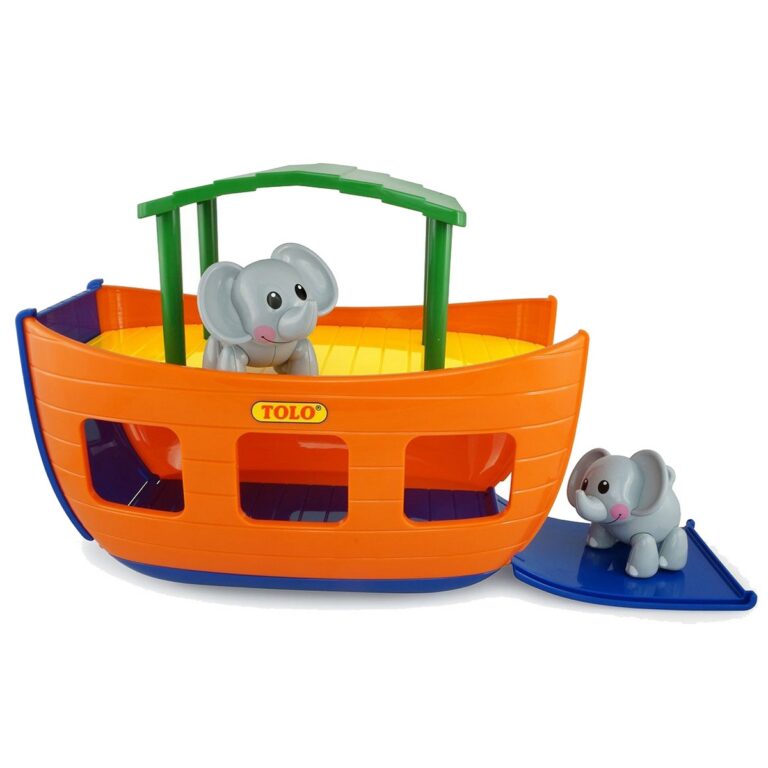 Questa colorata Arca di Noe' comprende due elefanti della serie First Friends di Tolo. Le piccole ruote nascoste fanno scorrere l'arca che si può spingere o tirare. Le rampe anteriori e posteriori possono essere sollevate per fare salire e scendere gli animali! Dimensione: 28x 19 x 34cm - Età: 1+